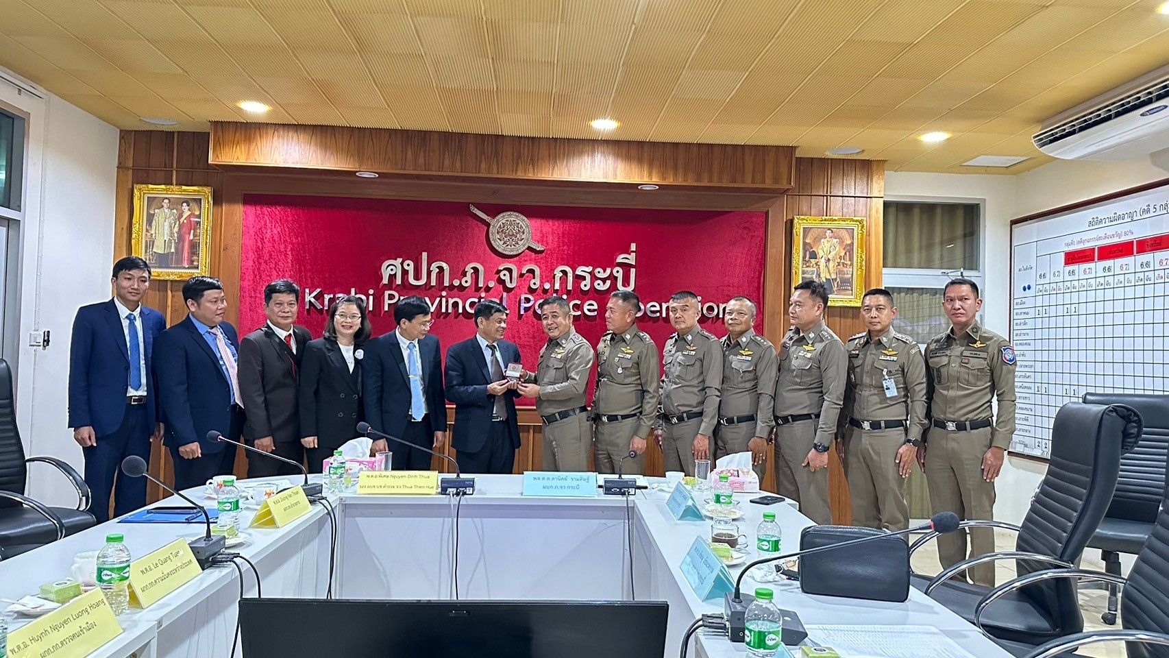 วันนี้ (2 ก.ค.67) เวลา 15.00 น. พ.ต.อ.พิเศษ Nguyen Dinh Thua รอง ผบช.บช.ตำรวจ จว. Thua Thien Hue สาธารณรัฐสังคมนิยมเวียดนาม และคณะ ในโอกาสเดินทางมาศึกษาดูงาน ณ ตำรวจภูธรจังหวัดกระบี่ โดยมี -พล.ต.ต.ตานิตย์ รามดิษฐ์ ผบก.ภ.จว.กระบี่ -พ.ต.อ.ชาณุชาญ ชลสุวัฒน์ รอง ผบก.ฯ -พ.ต.อ.พิษณุ อัชนะพรกุล รอง ผบก.ฯ -พ.ต.อ.ชวลิต เพชรศรีเปีย รอง ผบก.ฯ -พ.ต.อ.ศิริศักดิ์ สงพะโยม รอง ผบก.ฯ -พ.ต.อ.วิทยา เมฆใส รอง ผบก.ฯ -พ.ต.อ.สรธรรศจ์ เอี่ยมละออ ผกก.ตม.จว.กระบี่ -พ.ต.อ.สราวุฒิ เกาะกลาง สว.ส.ทท.3 กก.2 บก.ทท.3 ให้การต้อนรับ บรรยายสรุป และแลกเปลี่ยนแนวทางการบริหารงานตำรวจ​