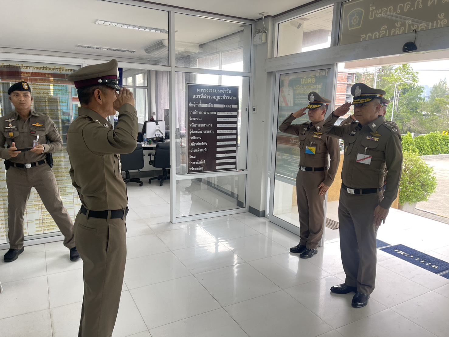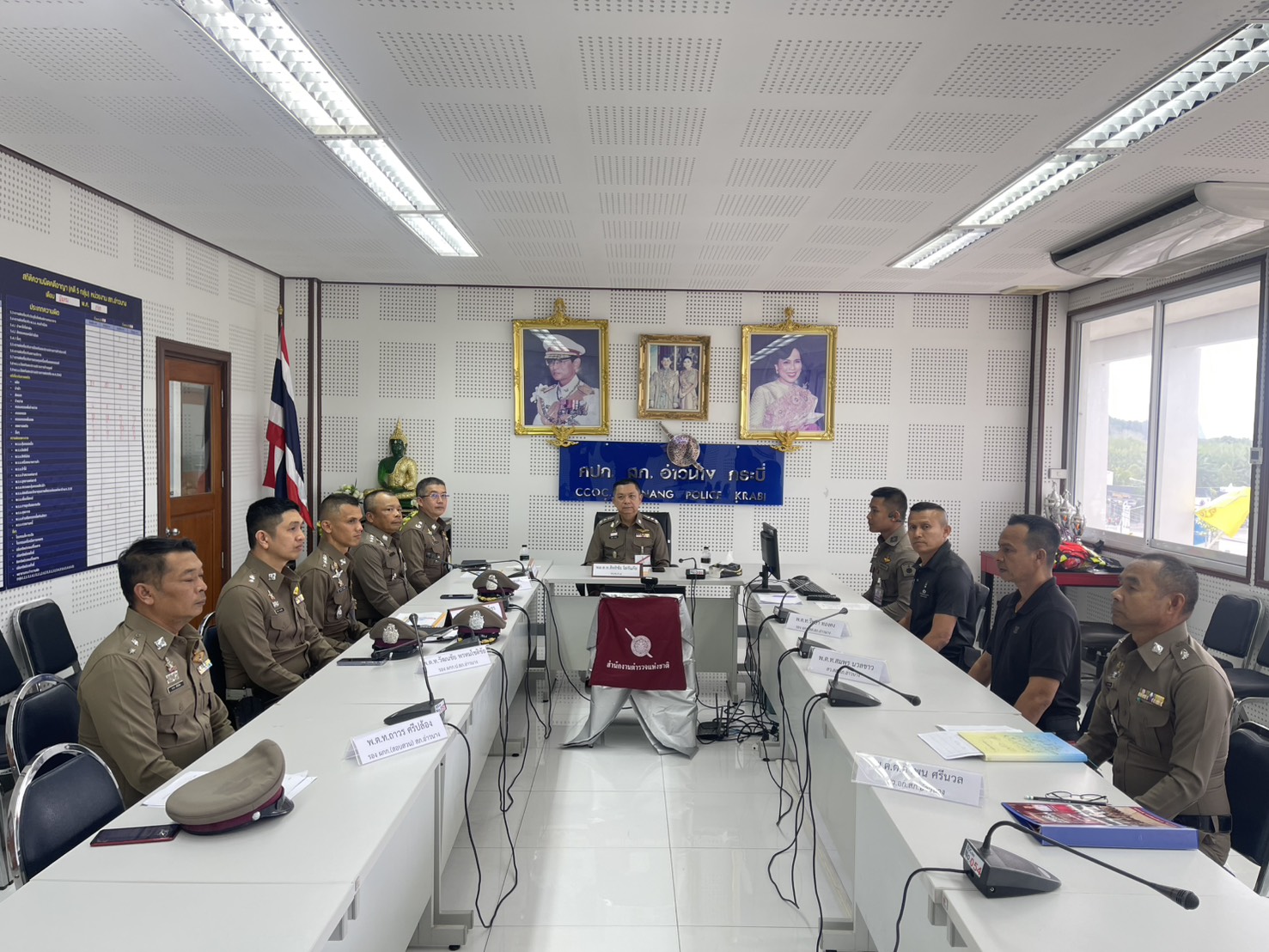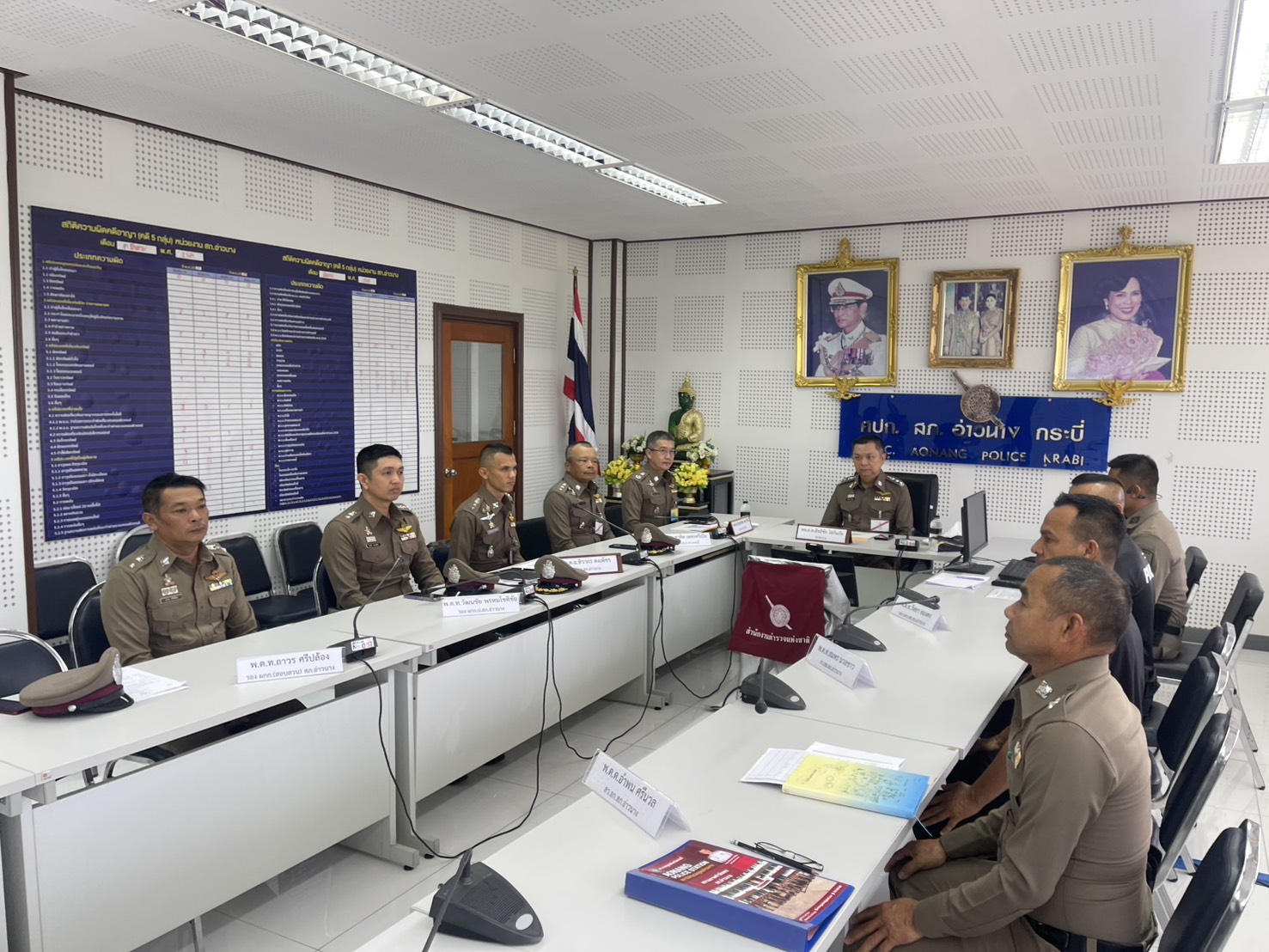 ​ประชุมบรรยายสถานการณ์และการปฏิบัติงานของสถานีตำรวจภูธรอ่าวนาง และได้มอบเสื้อกั๊กสะท้อนแสงให้กับเจ้าหน้าที่เพื่อได้ใช้ปฏิบัติงาน